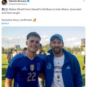 8月20日体育讯 知名记者罗马诺确认,迈阿密国际已与纽维尔老男孩达成协议,正式签下19岁阿根廷边锋西尔维蒂,转会交易完成...