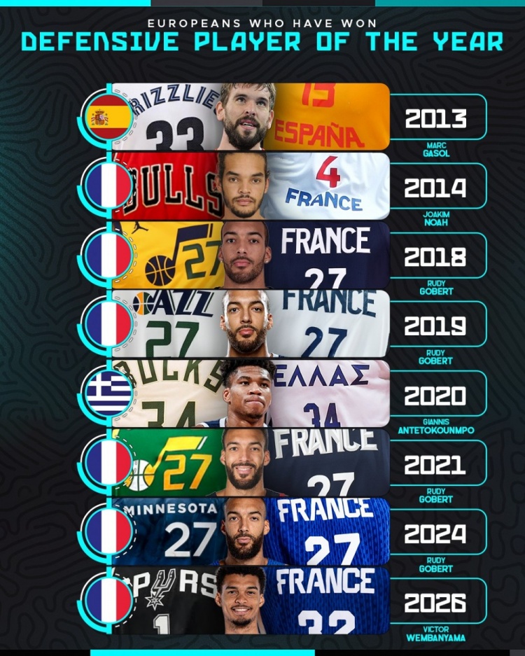开云官方-拿到过DPOY的欧洲球员:共计5人法国超一半 戈贝尔一人拿4次